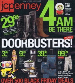 JCPenney will begin their Black Friday Sale at 4:00 am. The Ad Features over 500 Door Buster deals (valid until 1:00 pm) along with hundreds more “Big Buy” items that will remain on sale until their 11:00 pm close. JCPenney has a free gift for the early bird shoppers this year; it’s a Disney Snow Globe. There is no purchase necessary, and it is limited to one per customer while supplies last. Once again they are also including coupons in their Ad. Remember, like in the past, these coupons CANNOT be used on Doorbuster deals; they are for use solely from 2:00 pm – 11:00 pm Friday. The coupons being offered include $20 off $100, $15 off $75, and $10 off $50. These coupons can be used both in store and online.